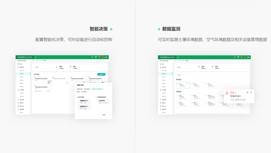 2020年公司專注于智慧農(nóng)業(yè)關(guān)鍵技術(shù)研發(fā),積極探索重慶智慧農(nóng)業(yè)發(fā)展新方向。先后服務(wù)酉陽(yáng)、石柱、南川、北碚等區(qū)域客戶智慧農(nóng)業(yè)云平臺(tái)建設(shè),受到業(yè)主一致好評(píng)。公司始終堅(jiān)持“產(chǎn)品+數(shù)據(jù)+技術(shù)+服務(wù)”的發(fā)展模式,致力于智慧農(nóng)業(yè)整體解決方案研發(fā)和服務(wù)。通過數(shù)據(jù)和技術(shù)雙輪驅(qū)動(dòng),實(shí)現(xiàn)農(nóng)業(yè)規(guī)模化、精準(zhǔn)化、智能化。